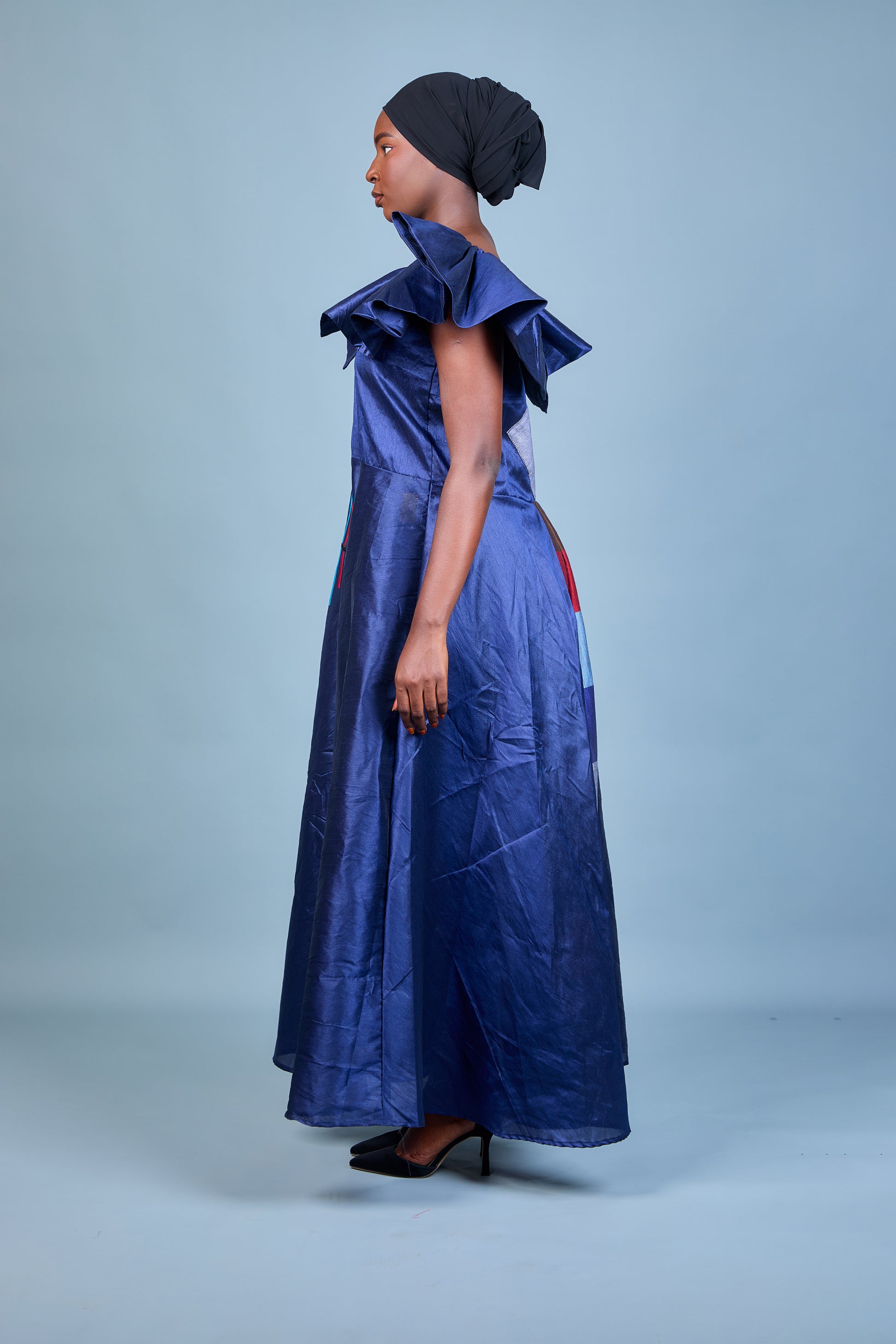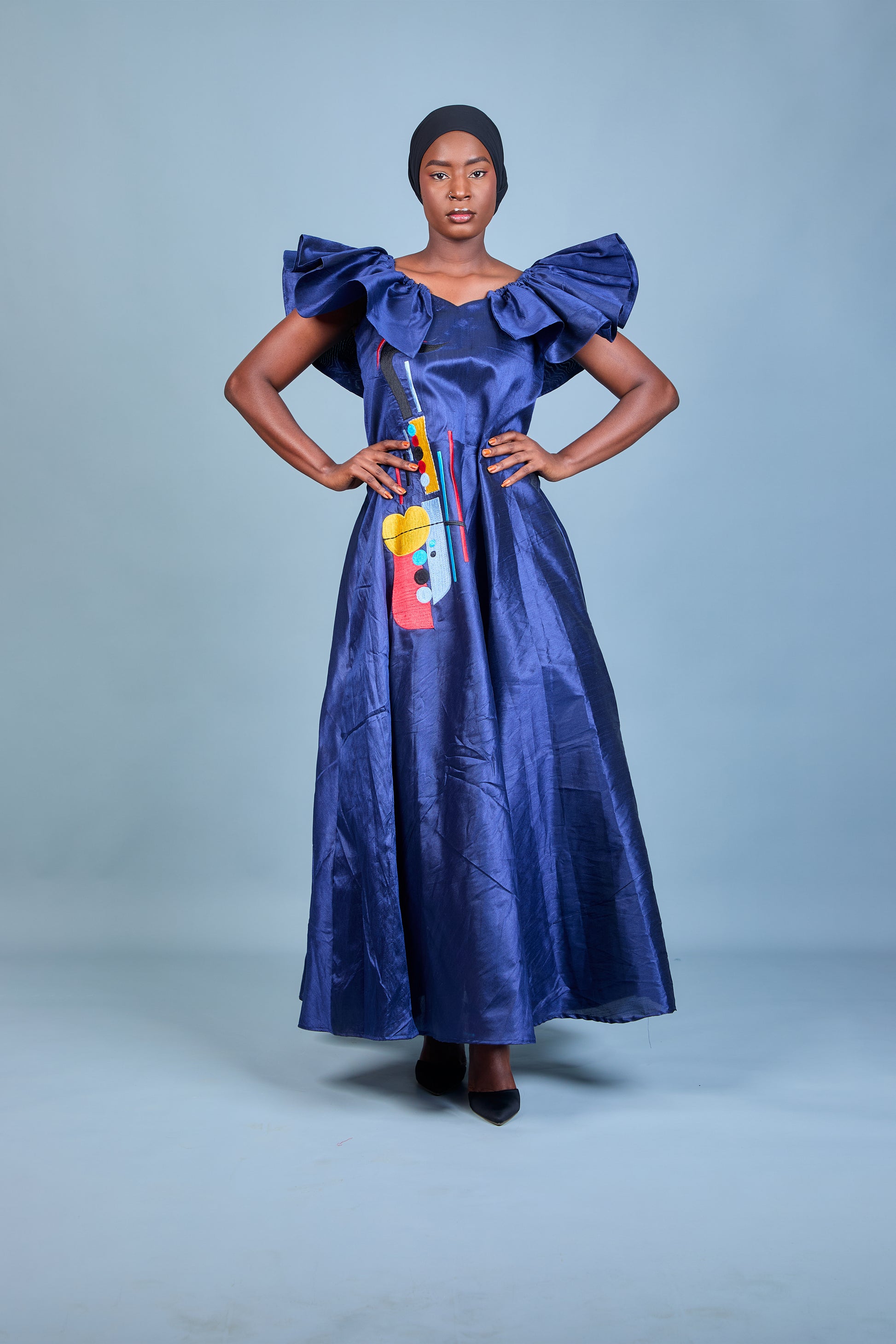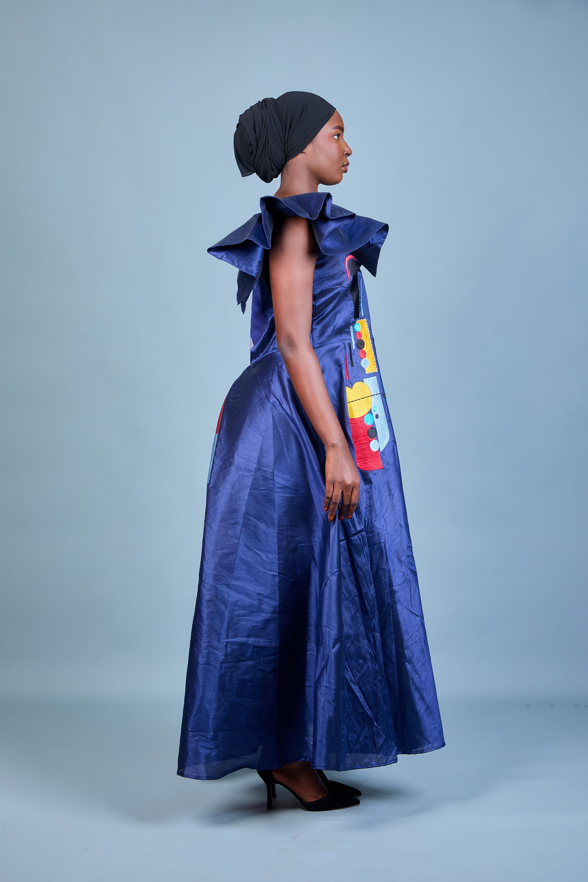 La robe Akue se distingue par son tissu en shantung bleu profond, offrant une allure sophistiquée et élégante. Sa coupe longue et fluide est sublimée par des manches volumineuses qui apportent une touche dramatique et moderne. Le design est enrichi par une broderie artistique multicolore sur le coté, ajoutant une note de créativité et d'originalité. Idéale pour les occasions spéciales, elle combine confort et glamour. Portex la avec des accessoires minimalistes pour mettre en valeur son caractère audacieux.