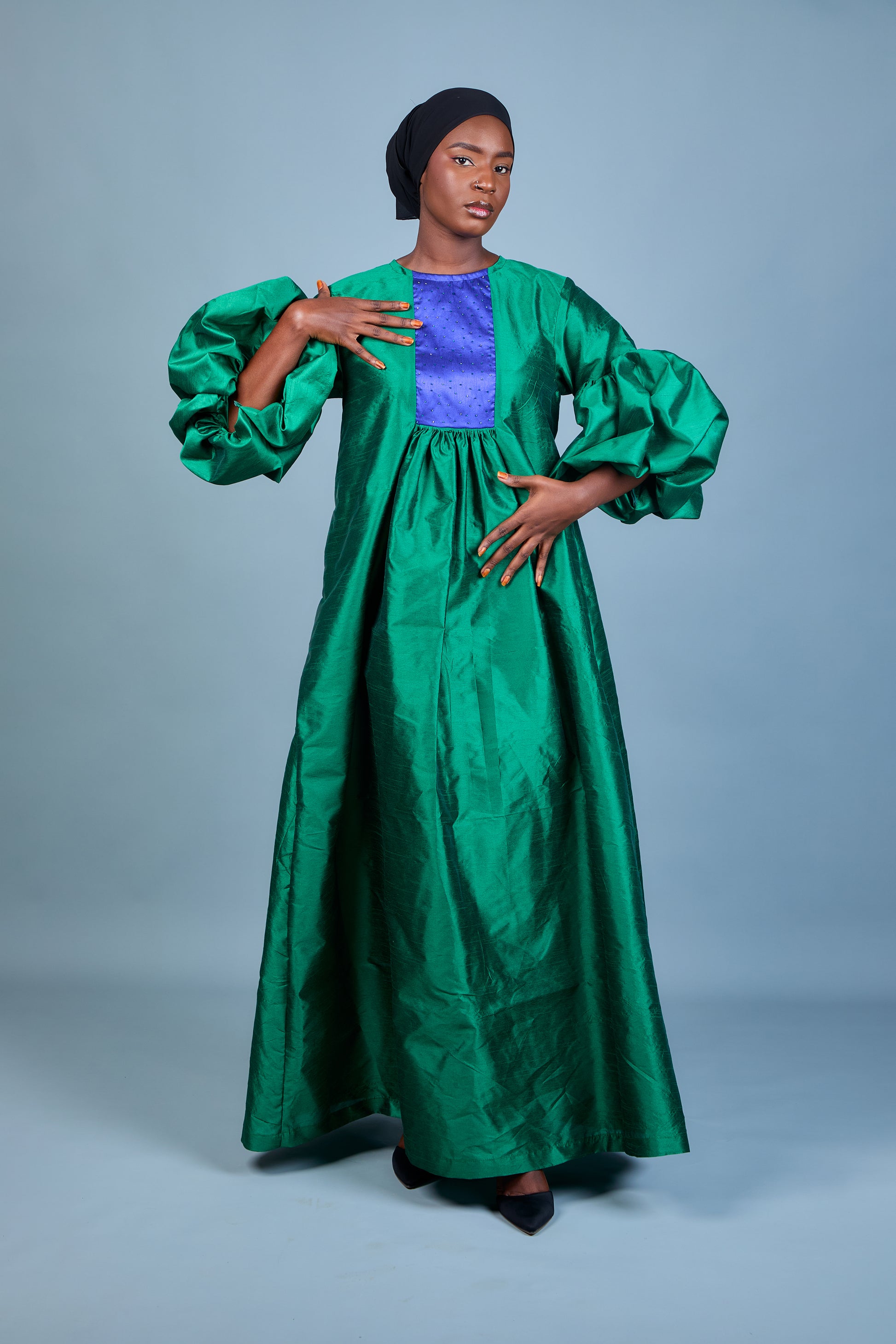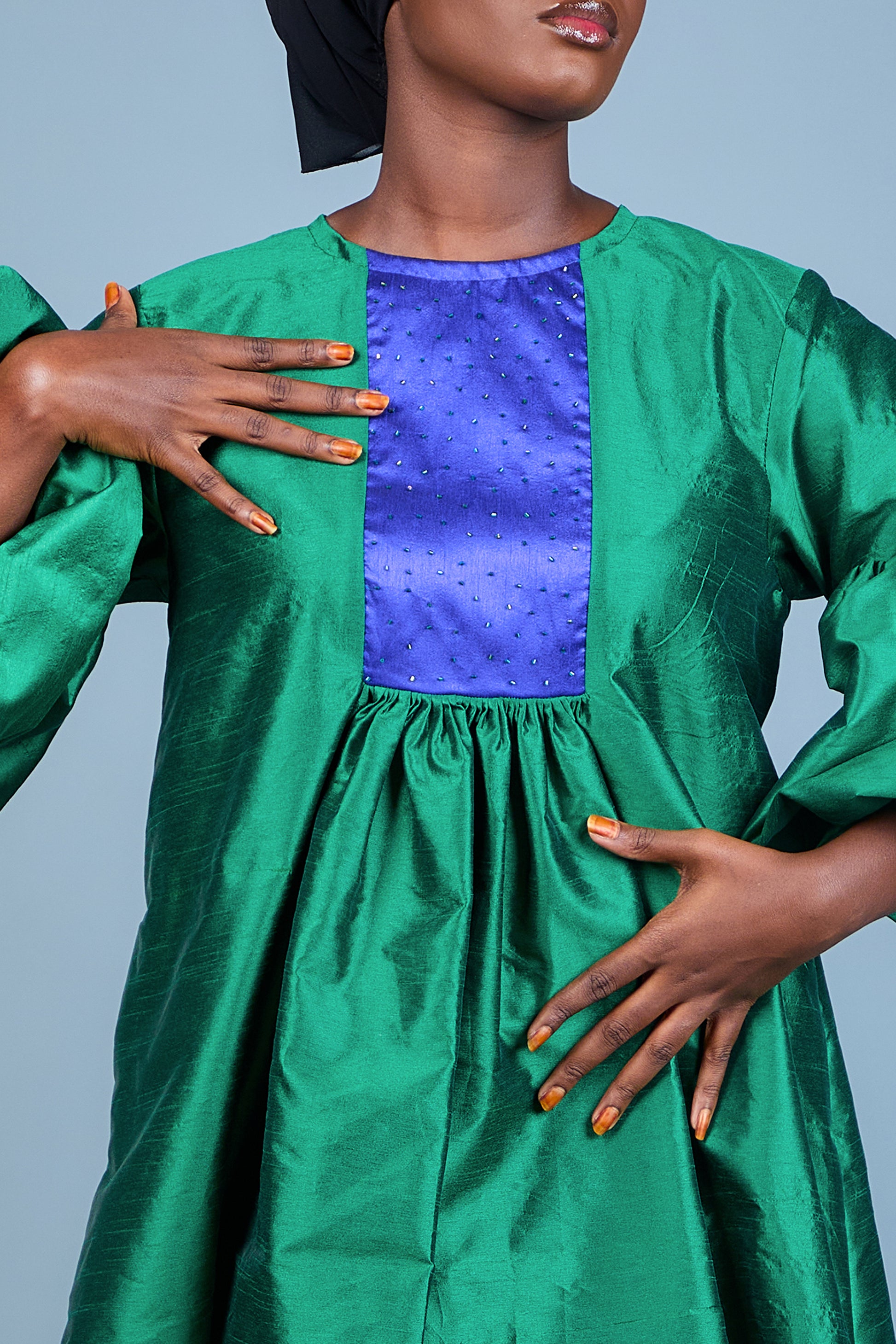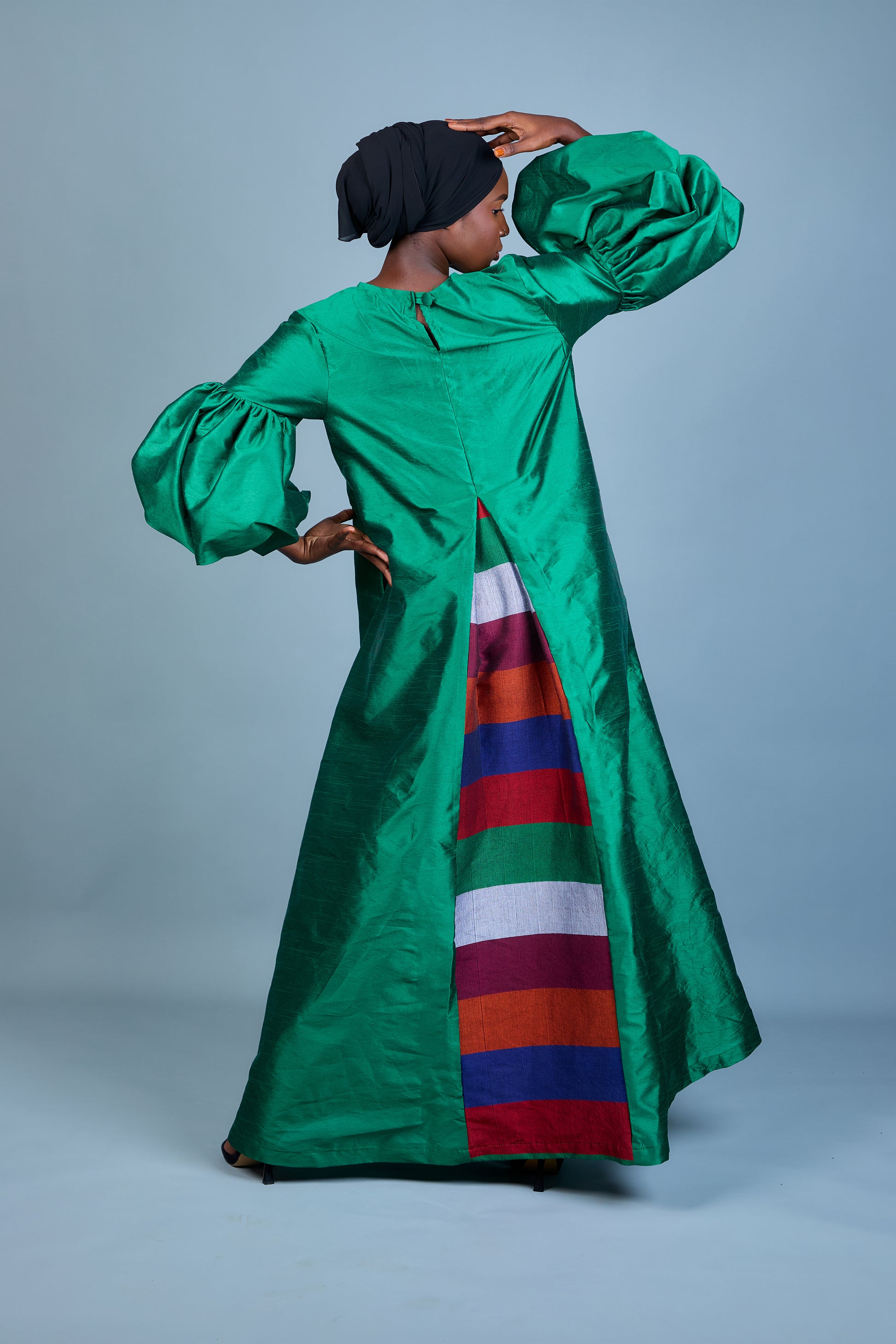 La robe Kashka est une pièce unique en shantung vert, parfaite pour celles qui osent se démarquer. Le devant est sublimé par un carré bleu, apportant une touche moderne et graphique. L’arrière dévoile un somptueux pagne tissé multicolore, symbole de richesse culturelle et d’authenticité. Idéale pour des occasions spéciales, Kashka allie style, tradition et modernité, un incontournable.