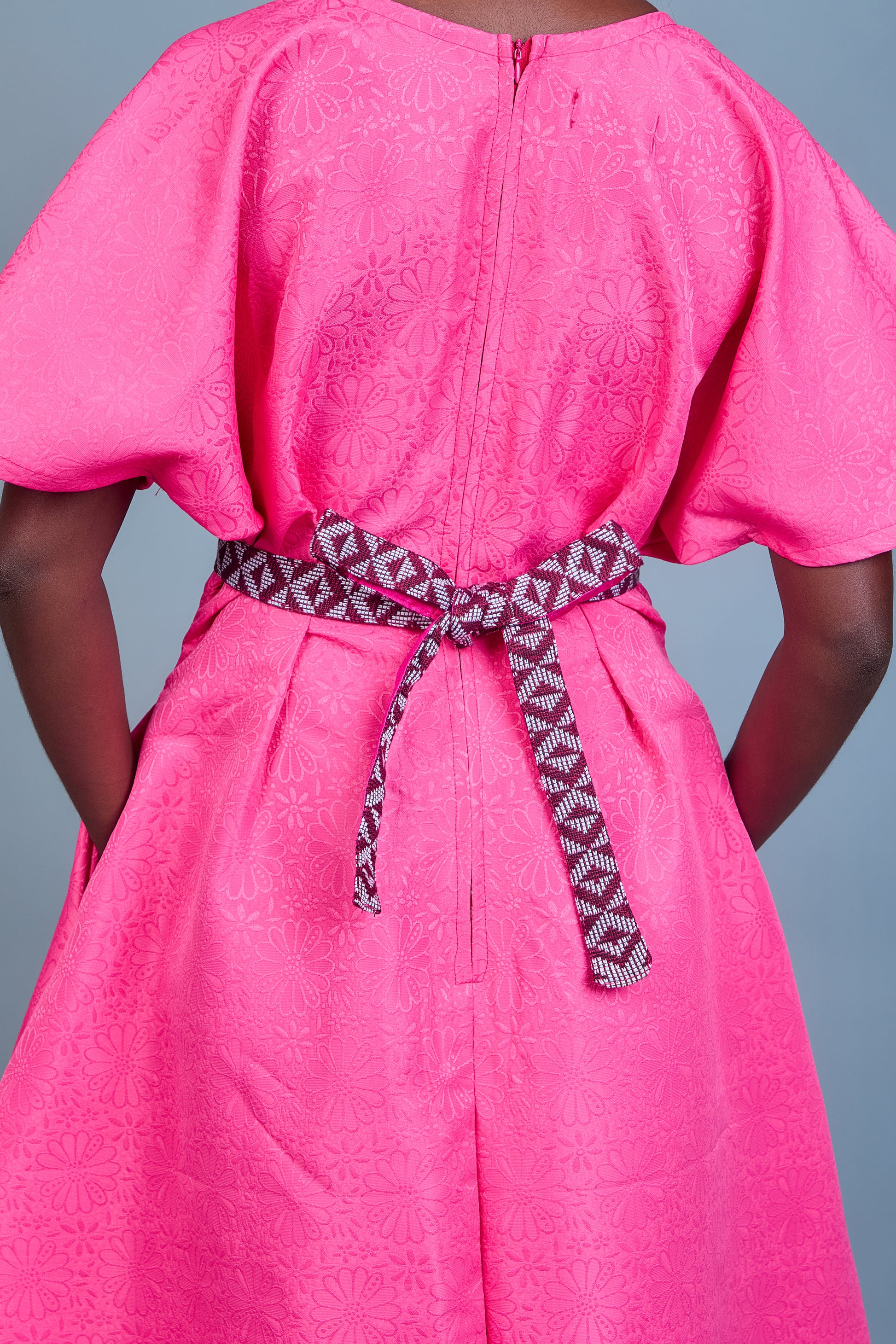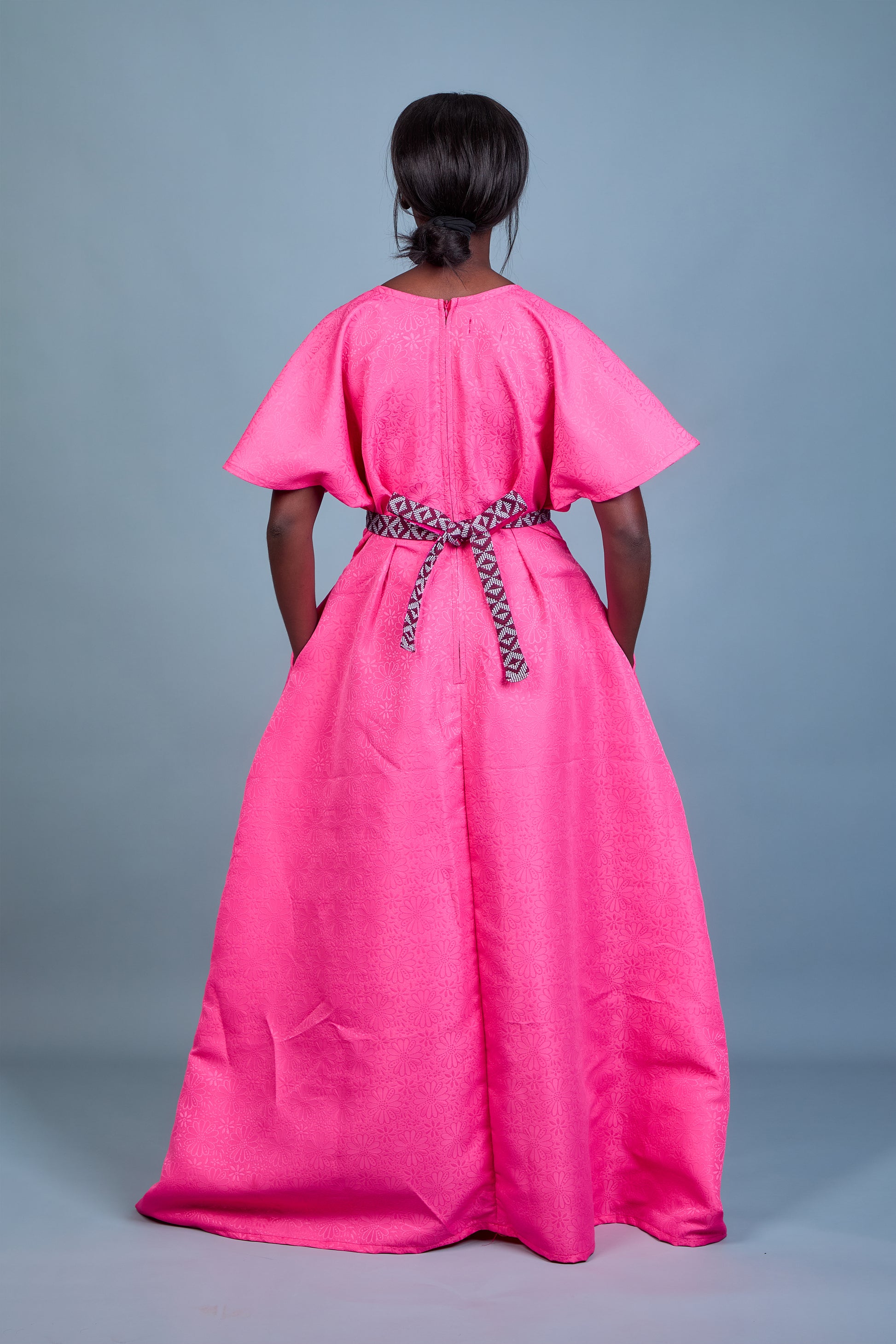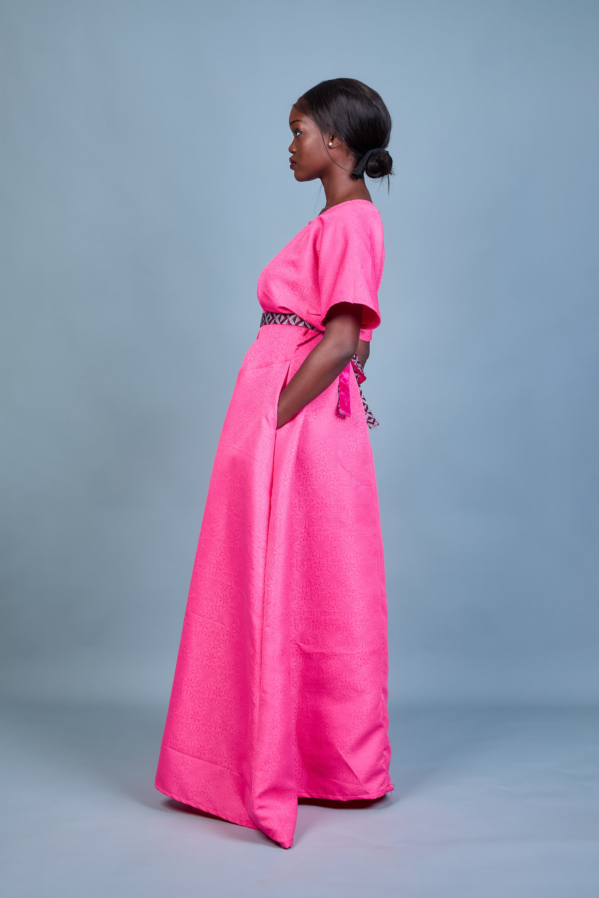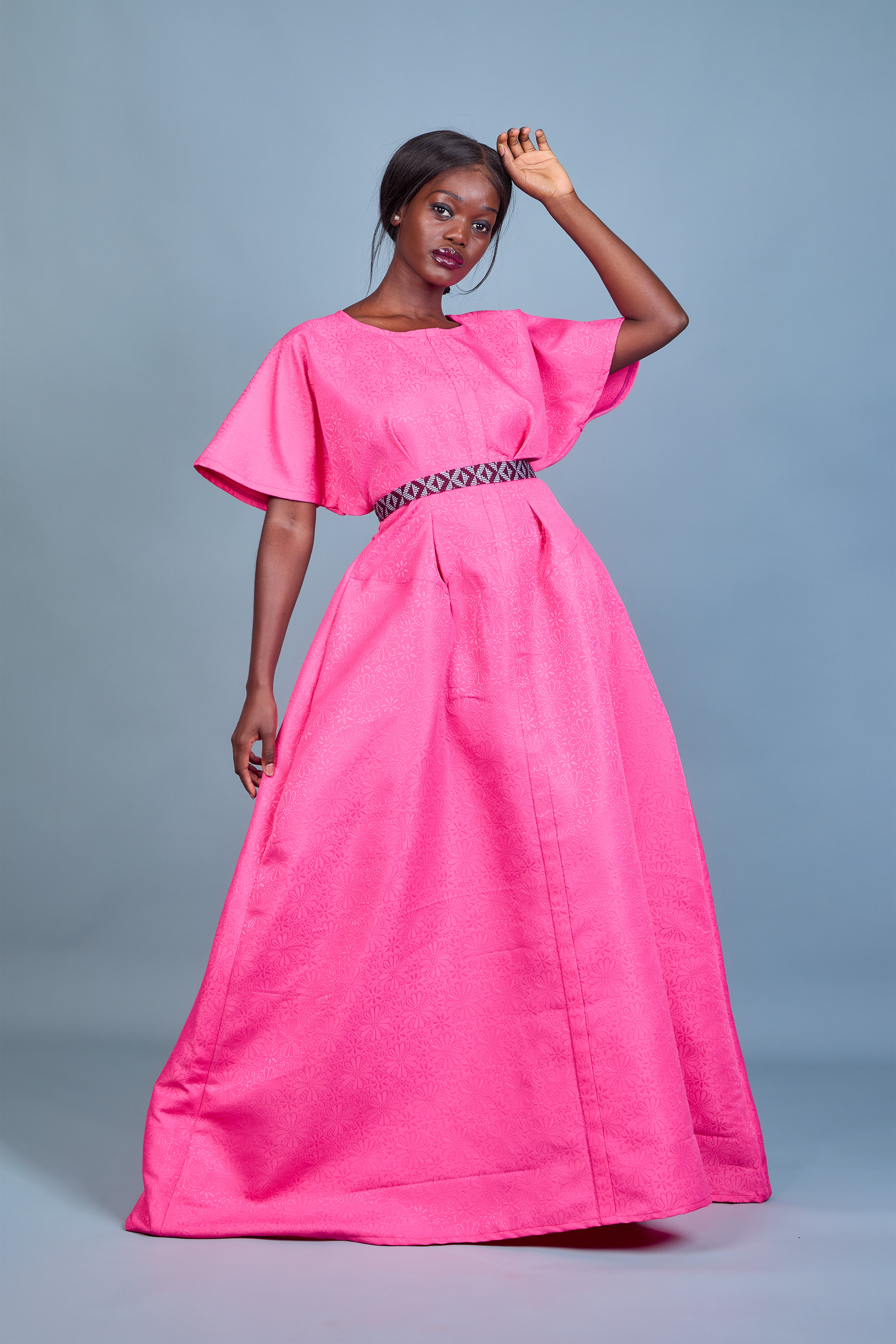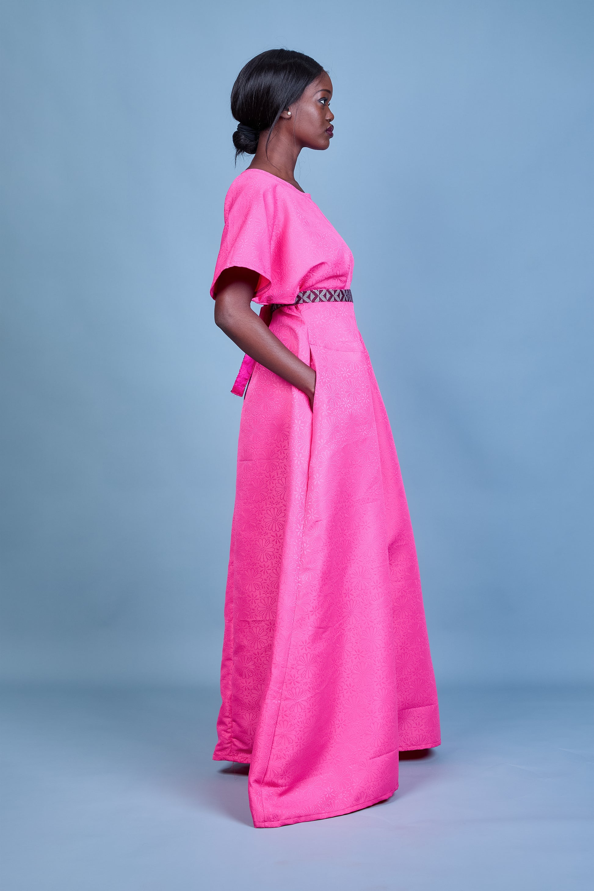 La robe Keyah en brocart rose charme par la richesse de son tissu à motif floral délicat. Ses manches asymétriques ajoutent une touche contemporaine, tandis que la ceinture en pagne tissé Manjak crée un contraste raffiné. Avec son col rond sublimant le décolleté, elle offre une élégance équilibrée. Mélange harmonieux de tradition et de modernité, Keyah est idéale pour sublimer les moments d'exception.