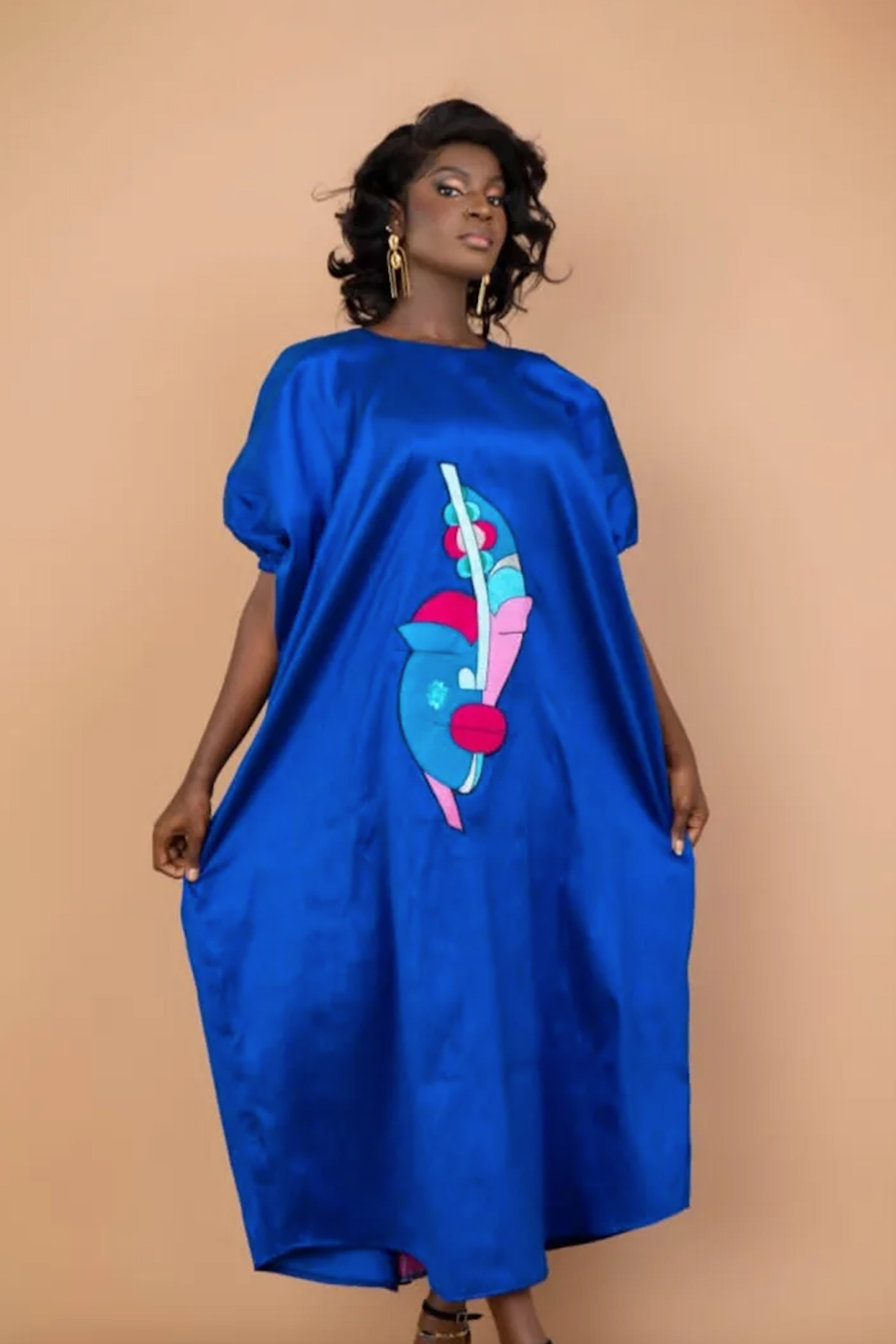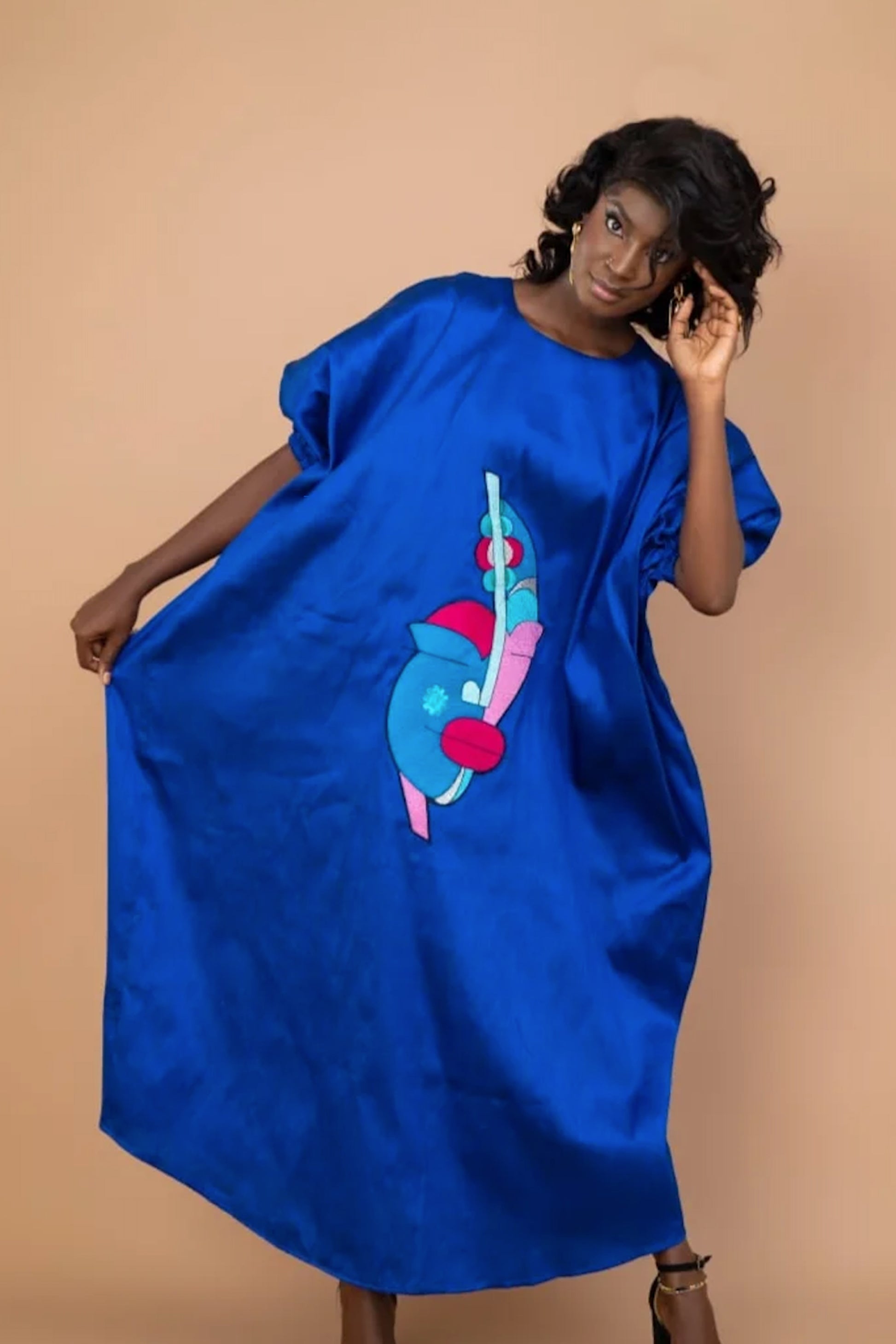 La robe Melia est une création en soie sauvage qui incarne l'élégance et la modernité. Sa coupe ample et fluide offre un confort sans compromis, tout en valorisant la silhouette. Elle est ornée d'un motif brodé aux couleurs vives sur le devant, ajoutant une touche artistique et contemporaine.Cette robe est une expression parfaite de la féminité et de la grâce.