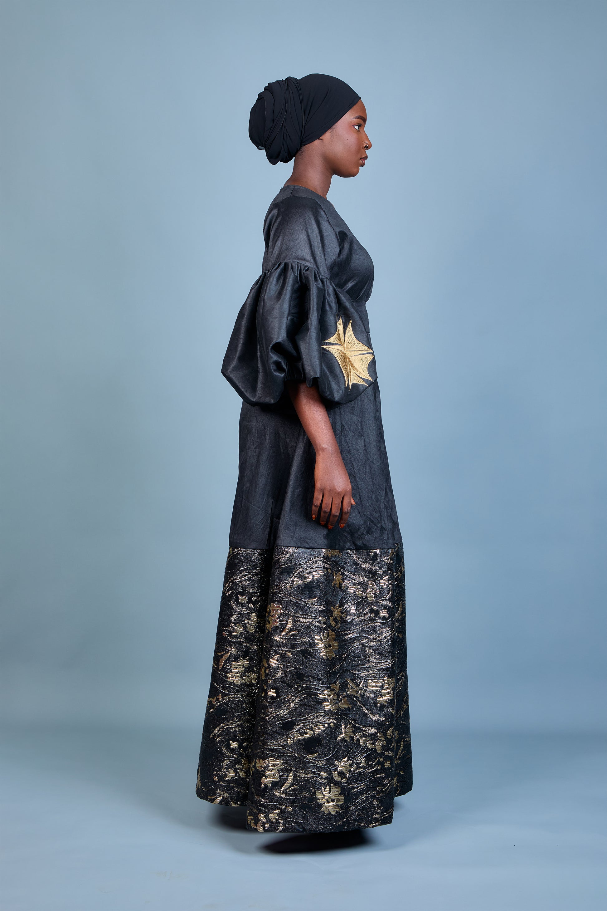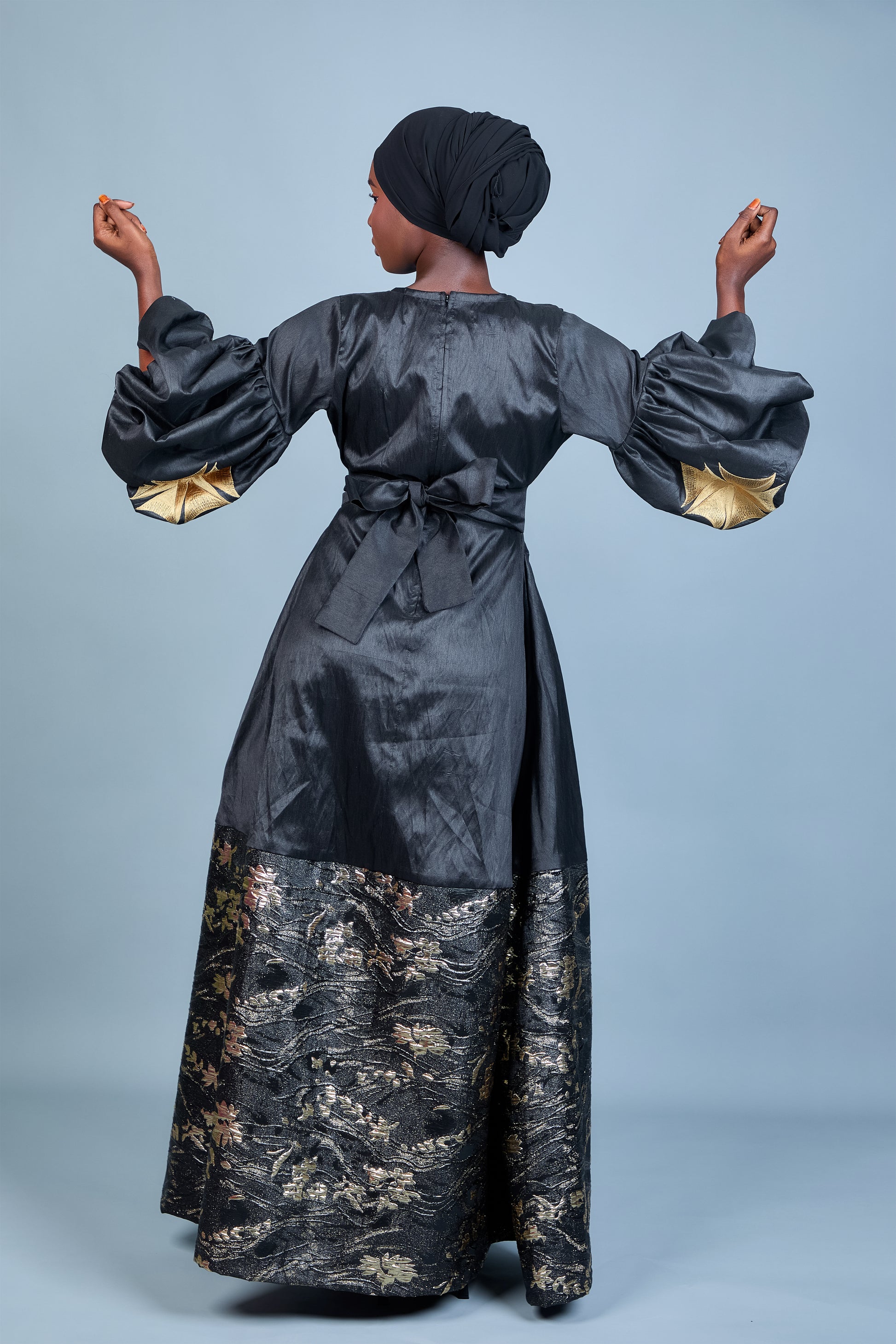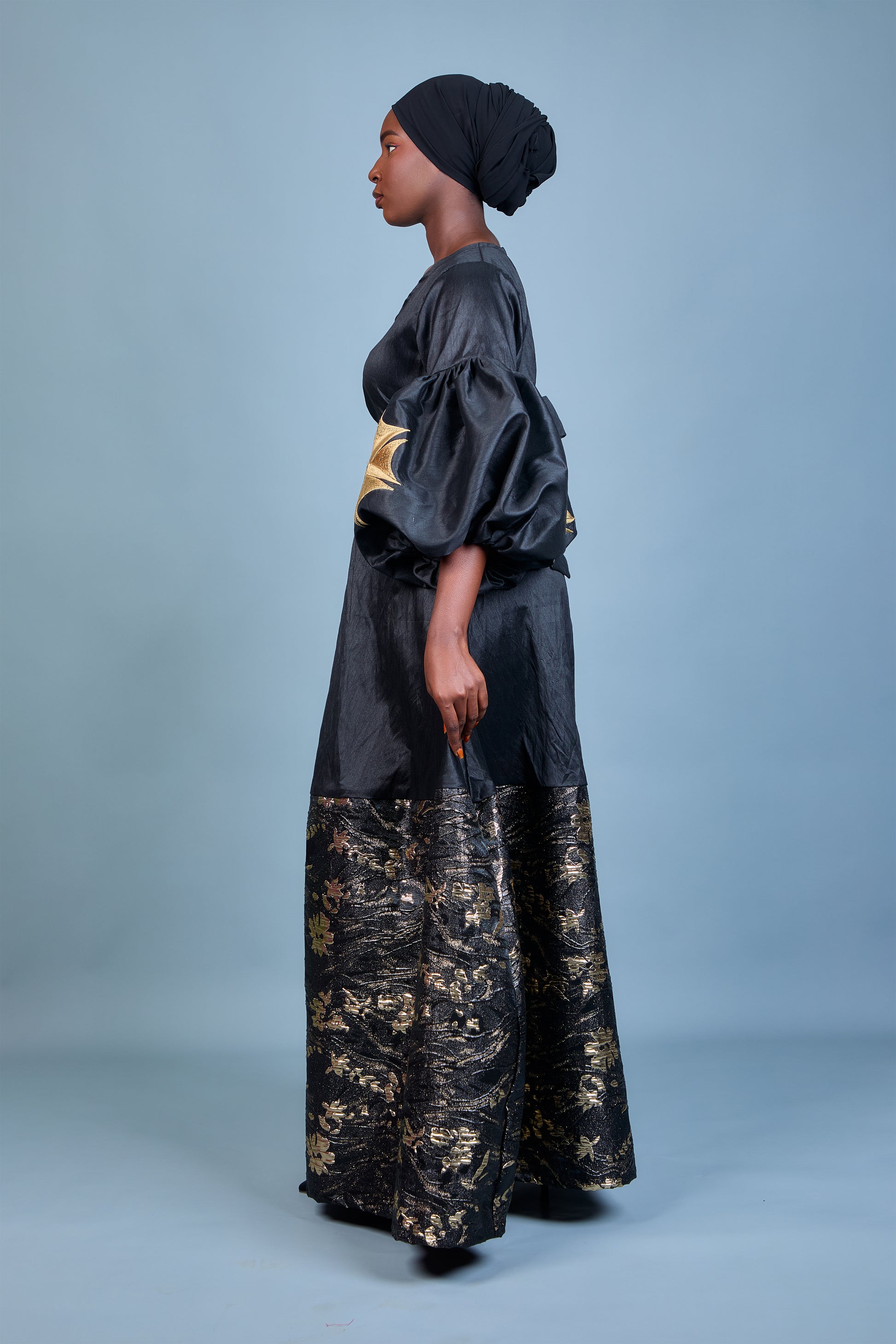 La robe Nana Esi est confectionnée en shantung noir et brocard raffiné. Ses manches bouffantes ornées de broderies florales délicates et de fil doré apportent une touche de majesté et d'élégance. Cette pièce intemporelle est idéale pour les occasions spéciales, alliant tradition et modernité avec finesse. Chaque détail est pensé pour vous offrir une silhouette élégante et unique.Nana Esi est synonyme d'excellence !