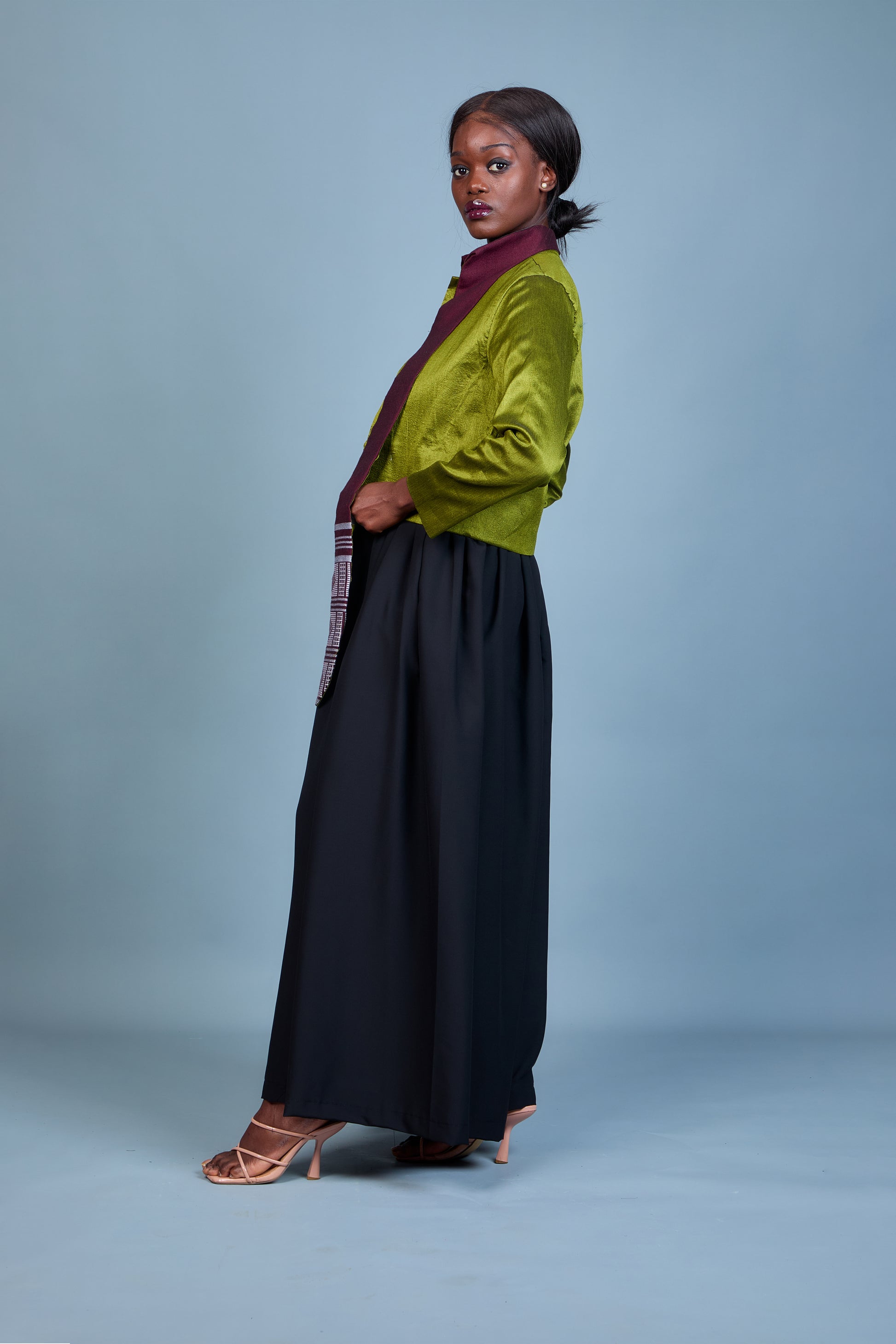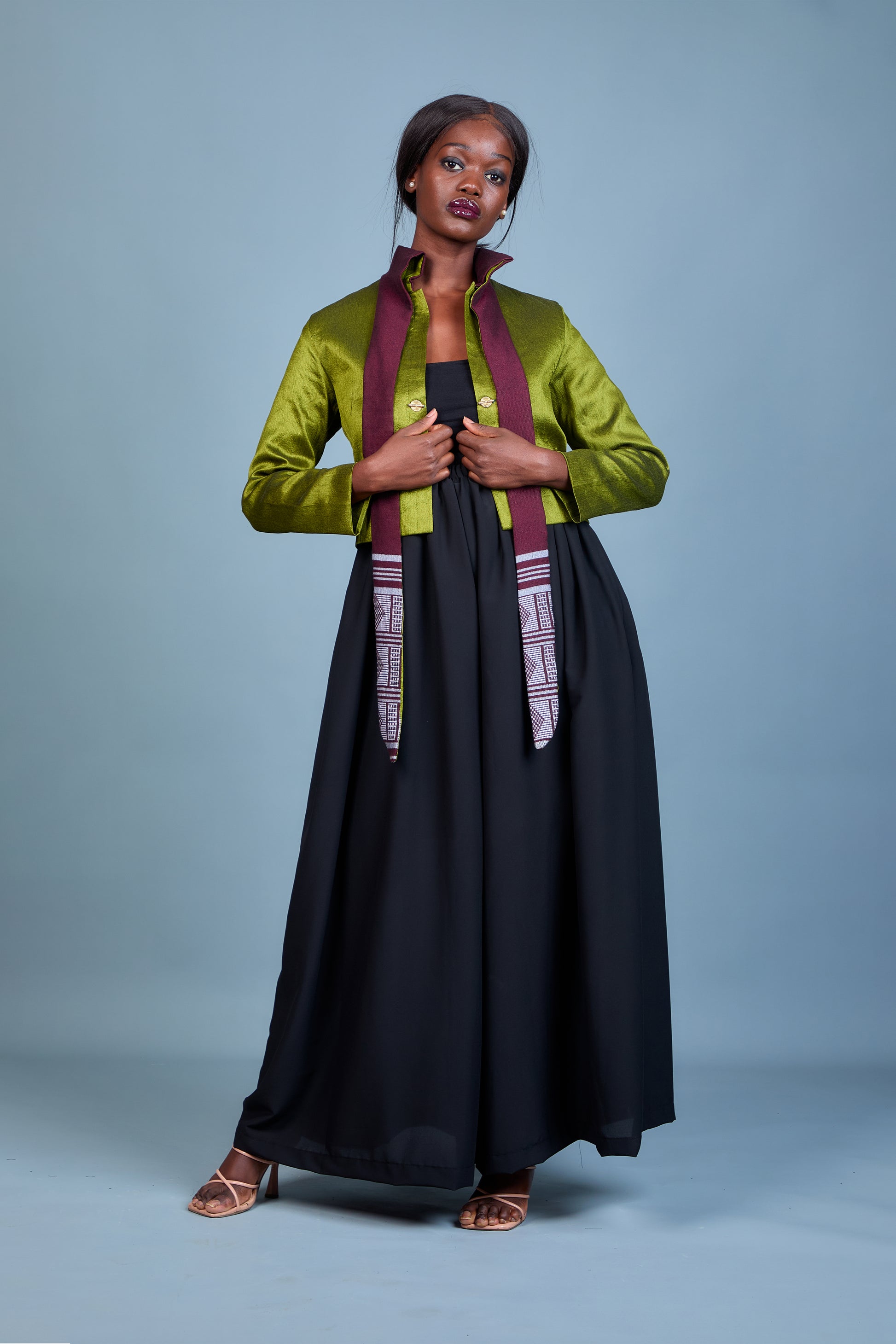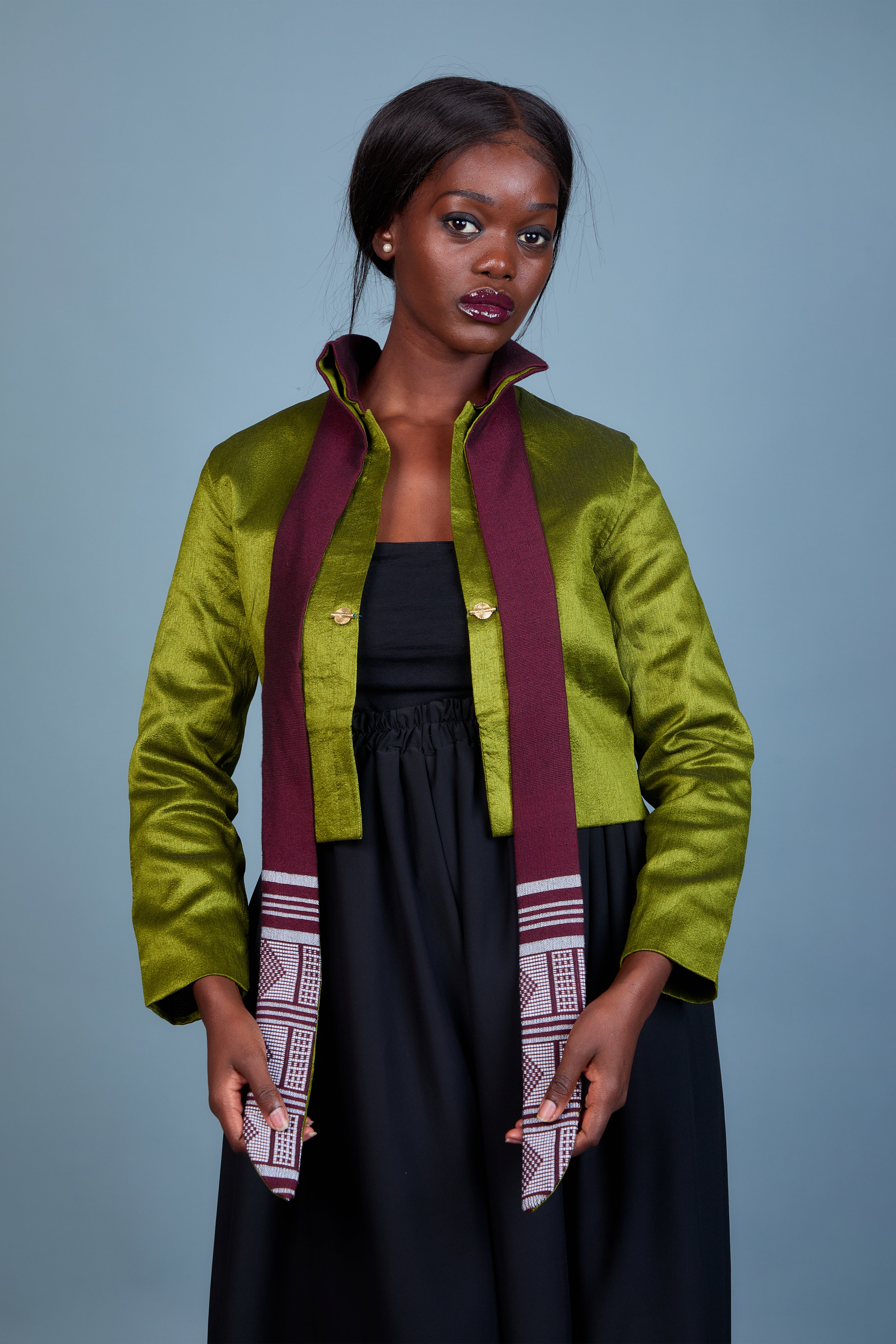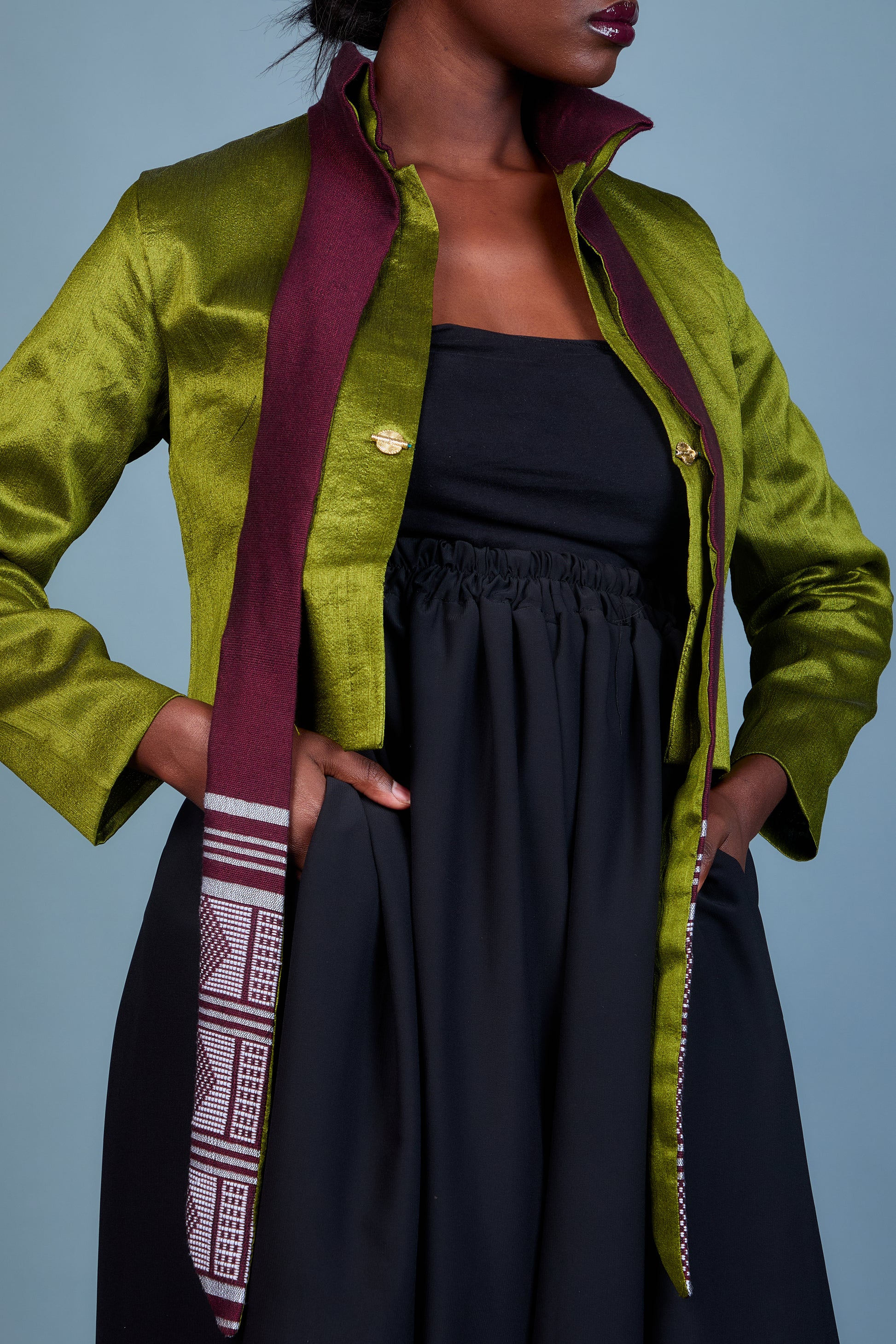 La veste Elam, en rouge vibrant et vert éclatant, est une création audacieuse qui mêle le luxe du shantung à l'authenticité du pagne Manjak. Son col unique en pagne Manjak apporte une touche artisanale et raffinée, tandis que les couleurs contrastées insufflent dynamisme et sophistication. Conçue pour un look chic et moderne, Elam est parfaite pour celles qui souhaitent se démarquer avec élégance. Cette pièce d’exception sublime chaque tenue, affirmant un style résolument unique.